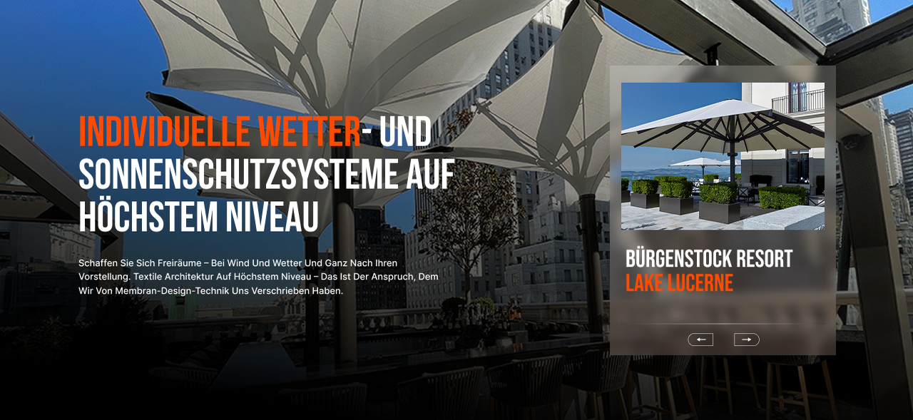 Herausragend stabil sind dabei unsere Teleskopschirme, die schon in der Standardversion für Windböen bis zu 60 km/h gewappnet sind wie unser Sonnenschirm Typ T. Noch stabiler sind die Varianten Typ TS und Typ TK, wie sie beispielhaft im Schweizer Bürgenstock Resort 500 Meter über dem Vierwaldstättersee zu sehen ist.
