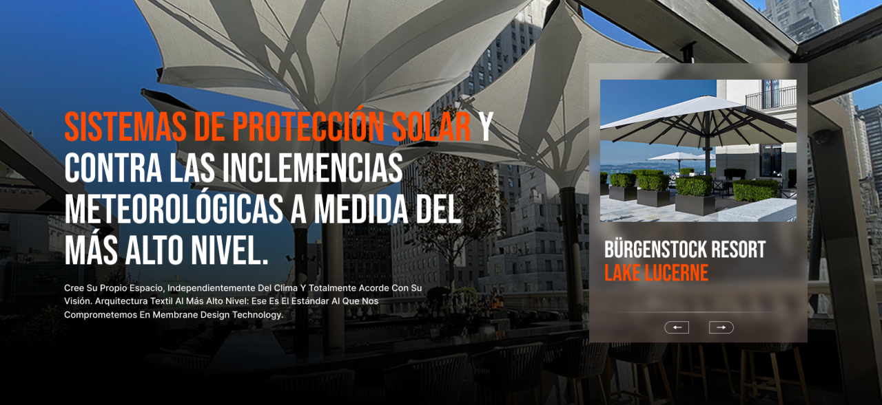 Nuestras sombrillas telescópicas son extraordinariamente estables. Incluso la versión estándar puede soportar ráfagas de viento de hasta 60 km/h, como nuestra sombrilla tipo T. La serie T es aún más estable. Aún más estables son las variantes tipo TS y tipo TK, como se ejemplifica en el complejo suizo Bürgenstock, a 500 metros sobre el lago de Lucerna.