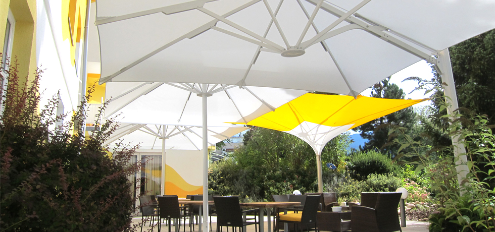 The use of multiple types of umbrellas gave the terrace a special touch, while completely protecting the area from rain. The sidearm umbrellas had a significant advantage for the terrace area since the mast is next to, not under, the umbrella, allowing the hotel to arrange the tables and seating flexibly. Our Typ E umbrellas, shaped like a tulip, were equipped with drainage systems, which cleared the rainwater that was funnelled through the masts of the umbrellas. Telescopic umbrellas were also chosen for the terrace, as they cover enormous areas while still being very simple to open and close.
